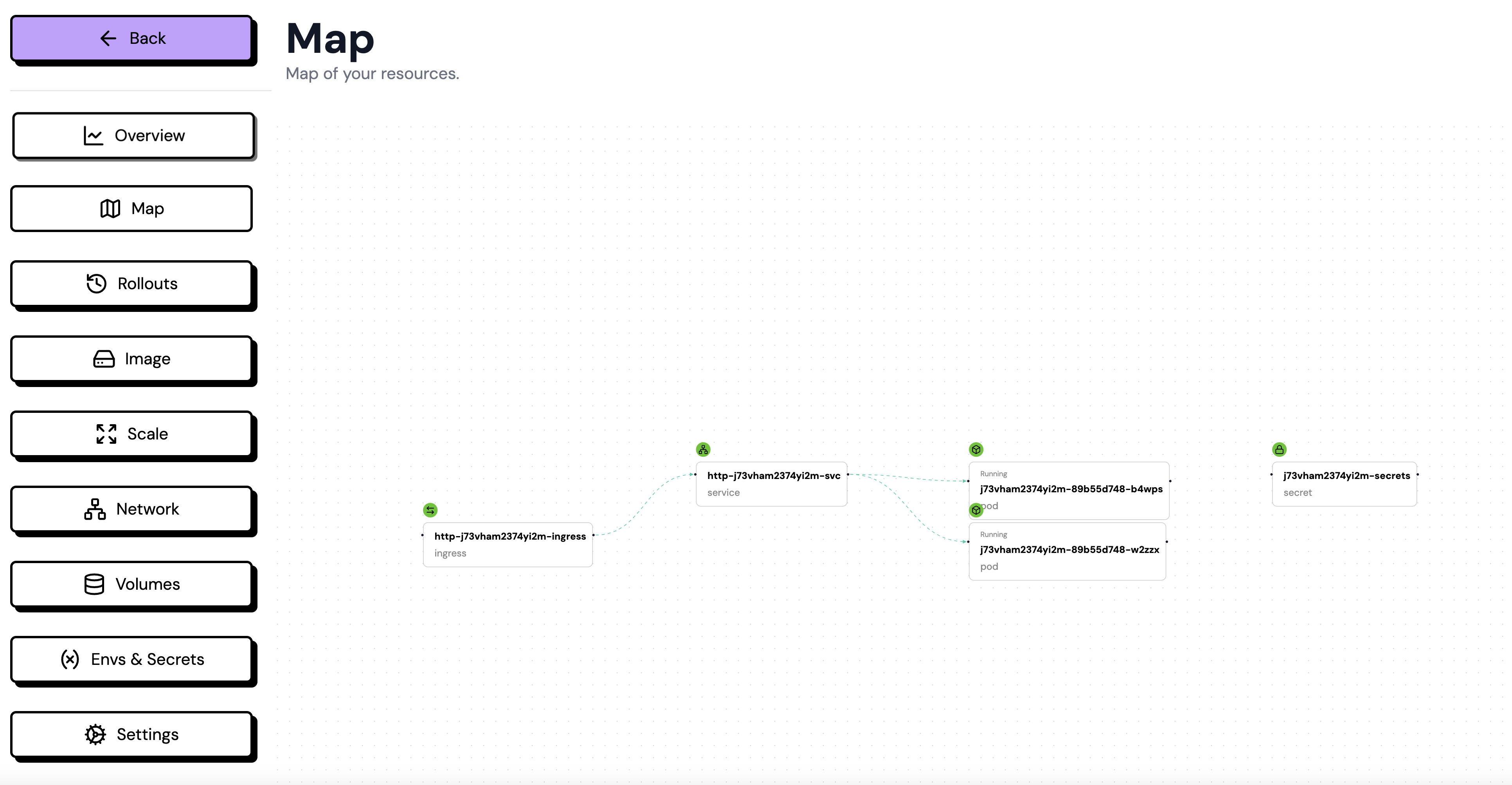 部署中的Map功能使用 React Flow 以图形方式显示选定部署中当前发布的资源。通过 NextBaaS 中的 websocket 端点,一切都可以实时更新: